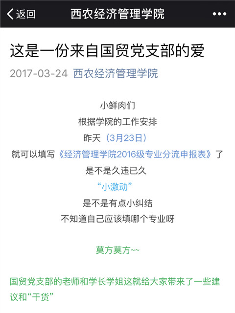 国贸支部全体党员积极行动,首先总结了2010-2017届国贸专业同学毕业流向,重点汇总了保研、考研、出国、考公务、仅金融机构及进我国百强企业的同学名单目录。其次,通过多种途径将信息传播出去。如在学院学工办的热情支持下利用“西农william威廉英国官网”微信公众平台推送“这是一份来自国贸党支部的爱”,阅读量达1000;利用微信圈子转发、制作《这是一份来自国贸党支部的爱》宣传手册等等。第三,联系已毕业及在校国贸优秀学子做主题报告或面对面交流。如优秀在读博士生侯建昀、硕士生黄腾、2013级就业达人裴玉璘、保研达人张馨月、张鹏飞以及2014级全面发展的张安琪、张怡萍、吴鑫桐等。大家以自己的亲身经历现身说法,为各位学弟学妹们展现了一个又一个鲜活的例子,也让学弟学妹们对于国贸专业有了一个全新的认识,侯建昀学长情真意切的演讲更是让大家对未来在国贸专业的学习与成长有了新的希望。我们不仅向学弟学妹们介绍了国贸专业的基本概况、发展方向、课程内容以及师资力量,而且提问环节对学弟学妹们提出的问题、疑惑进行了耐心的解答。
