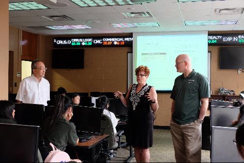 访学团进入商学院金融实验室后,商学院副教授Dr. Kirt Butter (Dr Erika Butler的丈夫)在这里给同学们上了一堂生动形象又实用的研讨课。他分享了自己和夫人各自的求学经历,介绍了金融学的发展、商学院各个学科的就业方向和工作前景。Butler夫妇对出国留学必备的一些基本知识和条件进行了解释,为同学们指明了未来学习的方向。研讨课结束后,Butler夫妇与大家合影留念。