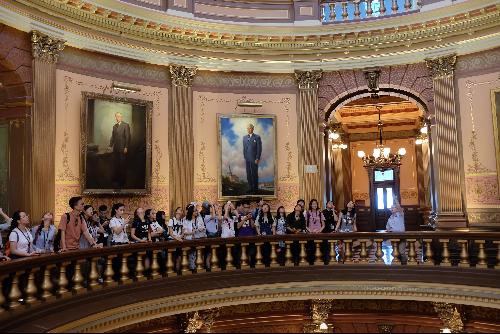 7月15日上午,密歇根州立大学(MSU)访学团一行来到了位于兰辛市的密歇根州议会大厦进行参观学习。经讲解员Cambray介绍,议会大厦落成于1879年1月1日,进入大厦就如同回到了过去,回到了有着精美的工艺,优雅、壮丽和华美的维多利亚时代。来到一楼,可以看到被称为“眼睛”的穹顶代表作璀璨的星空,下方是八副缪斯画像,分别是代表艺术、农业、法律、科学、公平、工业、商业、教育和人权的缪斯。再下边,可以看到历任州长的画像。Cambray带领大家参观了州长办公室、众议院和参议院,讲解了美国的民主制度。