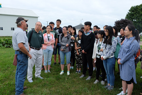随后,访学团又来到了与MSU有合作关系的一所示范农场,参观现代化的精准农业。农场主Mr. Gary Parr为同学们介绍了农场采用的精准农业生产技术。根据土壤肥力决定作物播种密度、深度,运用大型机械向作物根部施肥减少化肥用量,自建气象站实时掌握天气状况并做好应急措施。同时,Mr. Parr还为同学们介绍了农场盈利模式及购买农业保险的情况。MSU推广站研究员Dr. George补充到,学校与Mr. Parr的农场长期合作,大面积进行科研实验与推广种植,同时,Mr. Parr的农场也可以利用学校的研究成果,达到双赢的目的。