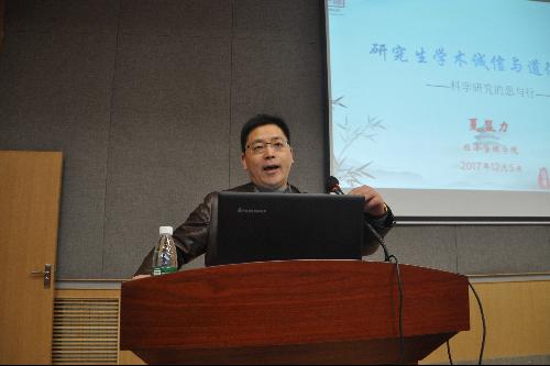 为进一步引导广大研究生建立良好的学术诚信与道德规范,增强学术规范意识,加强学术交流,营造崇尚科学的浓厚氛围,12月5日晚,夏显力教授应邀在经管园林大楼C101报告厅为william威廉官网2017级研究生作了题为“研究生学术诚信与道德规范——科学研究的思与行”的报告。