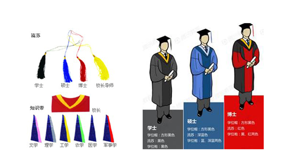 学位服是学位获得者,攻读学位者及学位授予单位的校(院、所)长,学位评定委员会主席委员(或导师)出席学位论文答辩会,学位授予仪式,名誉博士学位授予仪式,毕业典礼及校(院、所)庆,庆典等活动穿着的正式礼服。学位服作为专用服装,着装应符合下列规范: 一、学位帽 二、流苏 博士学位流苏为红色,硕士学位流苏为深蓝色,校(院、所)长帽流苏为黄色。 三、学位袍 四、垂布 垂布为套头三角兜,饰边处按文、理、工、农、医、军事六大类分别标为粉、灰、黄、绿、白、红颜色,垂布佩戴在学位袍外,套披在后背处,匍平过肩,扣绊扣在学位袍最上面纽扣上,三角兜自然垂在背后。垂布按授予学位的文、理、工、农、医、军事六大类分别佩戴。 五、附属着装 内衣:应着白或浅色衬衫。男士系领带,女士可扎领结。 学位服介绍 ①:学位服分为:校长服、校长(导师)服、博士服、硕士服、学士服五种; ②:每套学位服由学位帽、流苏、学位袍、垂布等四部分组成; ③:垂布按文、理、工、农、医、军事六大类,采用不同的饰边颜色区分; ④:流苏分为:校长(导师)流苏、博士流苏、硕士流苏、学士流苏。 附图: