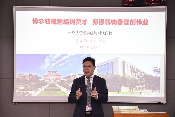 “数字经济赋能农业发展,会给农林高校带来哪些机遇和挑战?”9月27日,经管学院“我与院长面对面”活动现场气氛热烈,学院院长夏显力教授为新生做题为《博学明理通经树贤才,厚德载物善管创伟业》报告会。报告会由学院党委副书记张军驰主持,400余名新生采用线下与线上结合的方式参与。