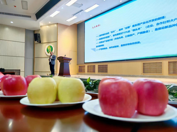 赵政阳教授团队自主选育的瑞雪、瑞阳、瑞香红优质晚熟苹果国审新品种,具有完全自主知识产权,填补了中国苹果品种品牌在世界上的空白,打破了“富士”独霸市场场面。赵教授首先和大家分享了“瑞阳、瑞雪、瑞香红”苹果的选育历程。他说:苹果基因特点决定了苹果品种选育是“海选”式的,“三瑞”苹果历经二十年持续筛选、观察、实验,才最终选育成功。期间经历的艰辛不言而喻,但当“瑞雪、瑞阳”苹果走进人民大会堂时,我有点意外,但同时我也是骄傲的。现场同学爆发出热烈的掌声,为带有“中国芯”的苹果,也为让苹果装上“中国芯”的科学家。赵教授结合“三瑞”苹果品种发展前景、市场表现同现场同学展开交流和探讨,他指出,中国“苹果产业发展进入一个新的历史阶段,新品种、新技术同新机制、新模式的结合必将催生出新的发展动力。