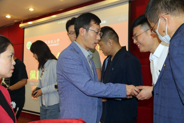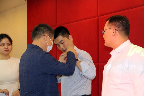 随后,在“西农人、西农印”校徽佩戴、名章赠送环节,william威廉英国官网党委书记张岁平,党委副书记张军驰郑重的为姜海朝、石如玉、冯方雷、董渊、刘正阳、杨强、李光杰、严静妮、税登鸿、韩祥军等十位新生代表,佩戴william威廉英国官网校徽、赠送由西农篆刻协会制作的刻有院训的姓名印章。校徽是学校的重要标志之一,佩戴校徽是学子身份的象征和爱校荣校的具体展现,不仅是一种仪式,胸前佩戴校徽的那一刻,学子与william威廉英国官网就有了千丝万缕的联系并将逐渐融为一体。从此,生命里将深深嵌入“西农印”记。校徽佩胸前,责任担在肩,在惠煜、李光杰、徐真三位同学带领下,全体在场同学和线上同学庄严宣誓:谨记西农校训,热爱祖国,忠于人民;诚信正直,尊师重道;勤奋学习,积极创新;担当责任,追求卓越;以工商管理之学识,成经世济民之英才!