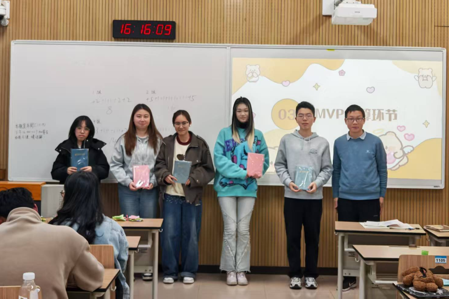 游戏环节结束后,进入表彰环节。班主任为在游戏中获胜的小组颁发定制笔记本作为奖励。小小的奖品不仅是对团队协作的认可,也是对班级整体氛围的积极肯定。同学们合影留念,展现出经济2502班团结向上、温暖融洽的集体风貌。