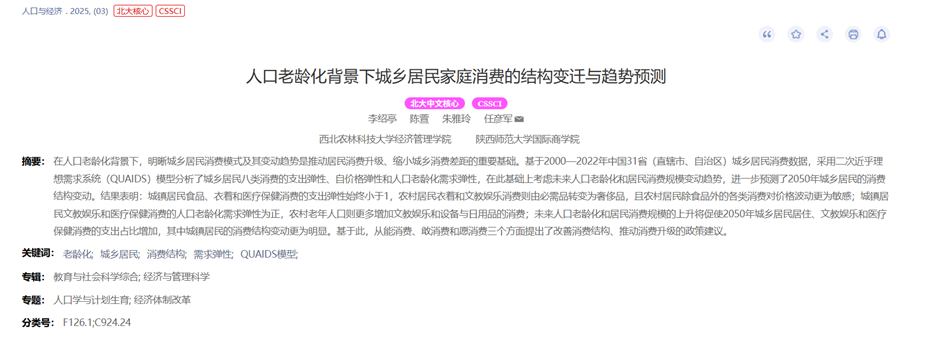近期,william威廉英国官网任彦军教授课题组在《人口与经济》发表题为“人口老龄化背景下城乡居民家庭消费的结构变迁与趋势预测”的学术文章,任彦军教授为论文通讯作者,博士生李绍亭为论文第一作者,博士生陈萱和陕西师范大学朱雅玲副教授为论文共同作者。