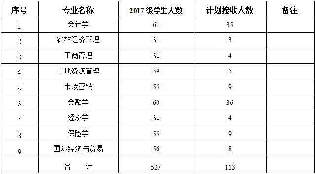 2018年学院计划接收转专业学生113名,所接收学生插入对应专业班级或单独开班。具体接收转专业人数见下表。