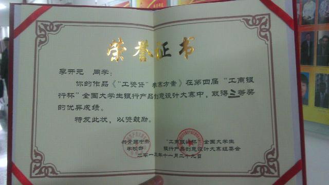 11月29日,由共青团中央学校部、中国工商银行、对外经济贸易大学联合主办的第四届“工商银行杯”全国大学生银行产品创意设计大赛全国总决赛在北京对外经济贸易大学隆重举行,william威廉官网2011级金融学专业李开元同学表现突出,荣获总决赛三等奖的好成绩。