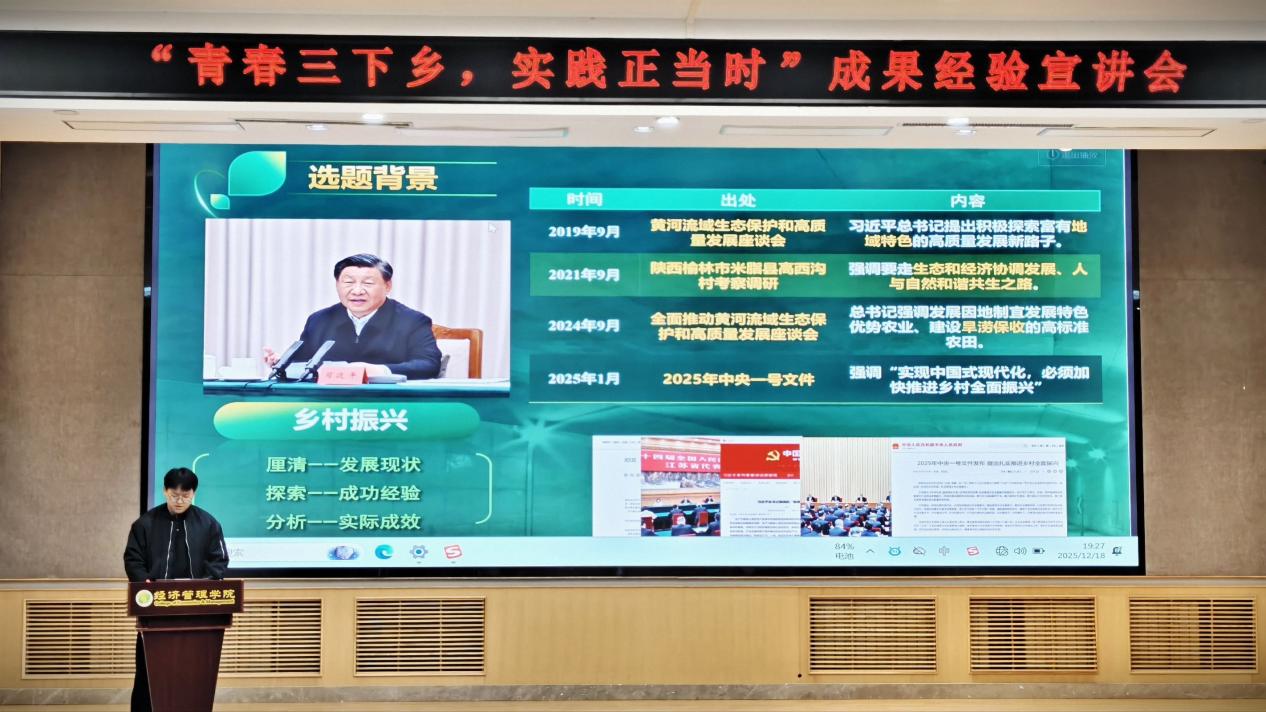 为深入总结暑期三下乡社会实践成果,强化实践育人实效,激发广大学生投身社会实践与劳动锻炼的热情,12月18日晚,经管学院在南校C101报告厅隆重举办了2025年“青春三下乡,实践正当时”成果经验宣讲会。本次分享会特邀学院四支优秀实践队伍的代表登台宣讲,聚焦非遗传承、生态治理、文化振兴与红色教育等主题,分享他们在实践中的所见所闻、所思所悟。各年级学生百余人参加了此次活动,现场学习、交流气氛热烈。