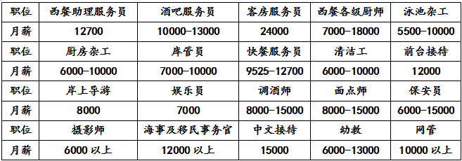 三、招募岗位:邮轮上的岗位设置有上百种,下表为部分岗位和薪资